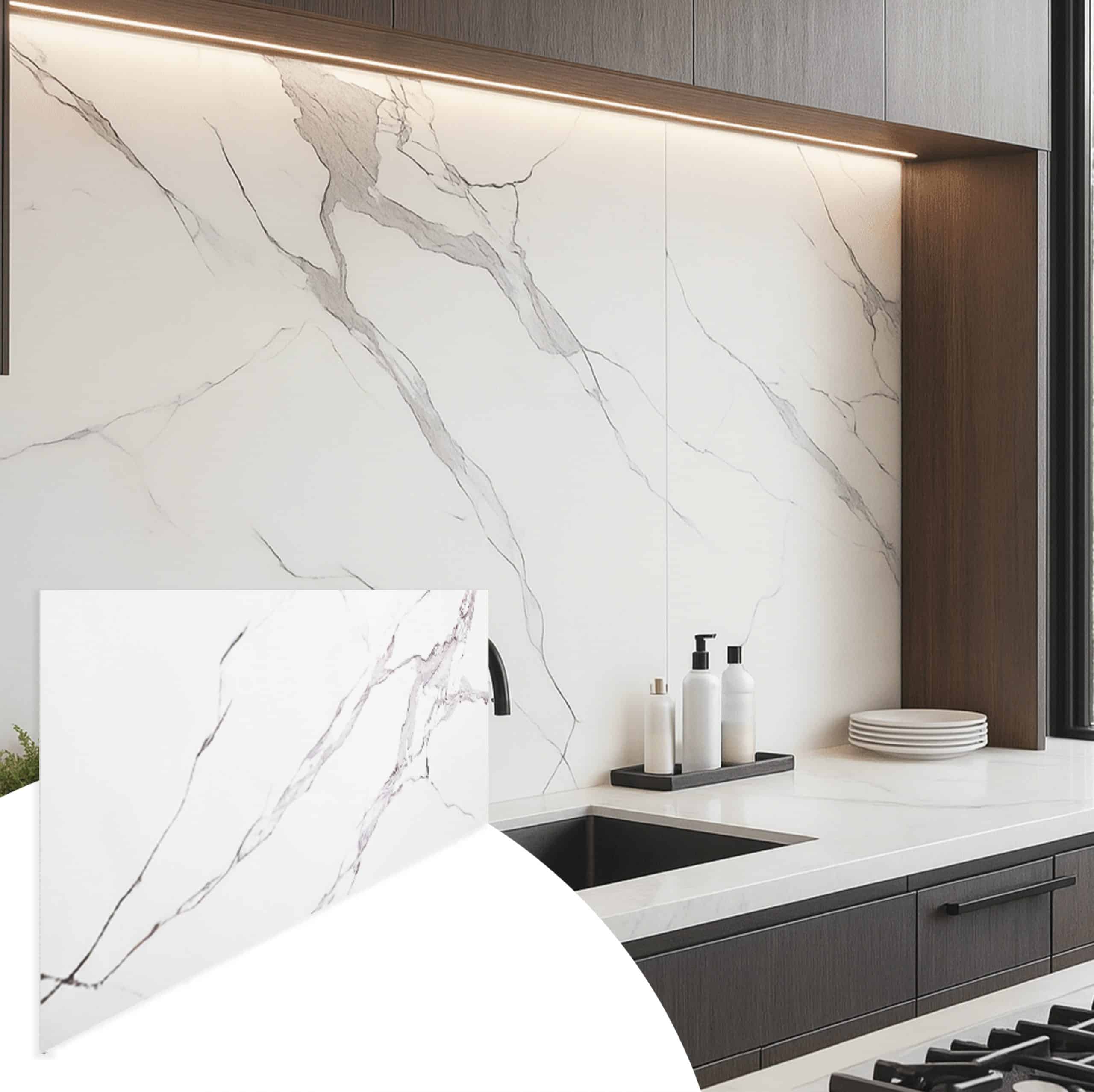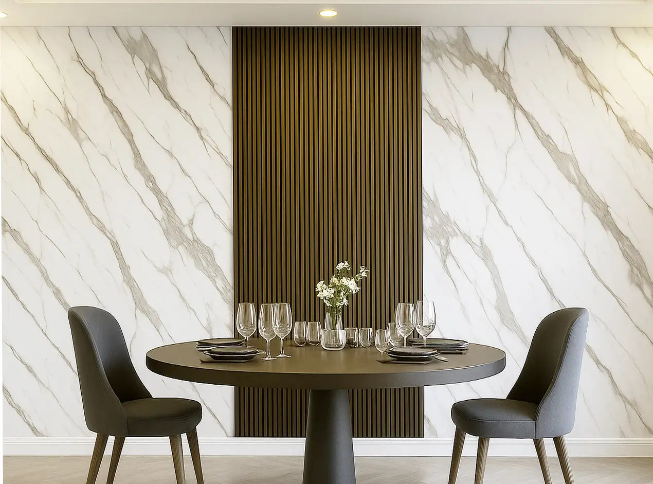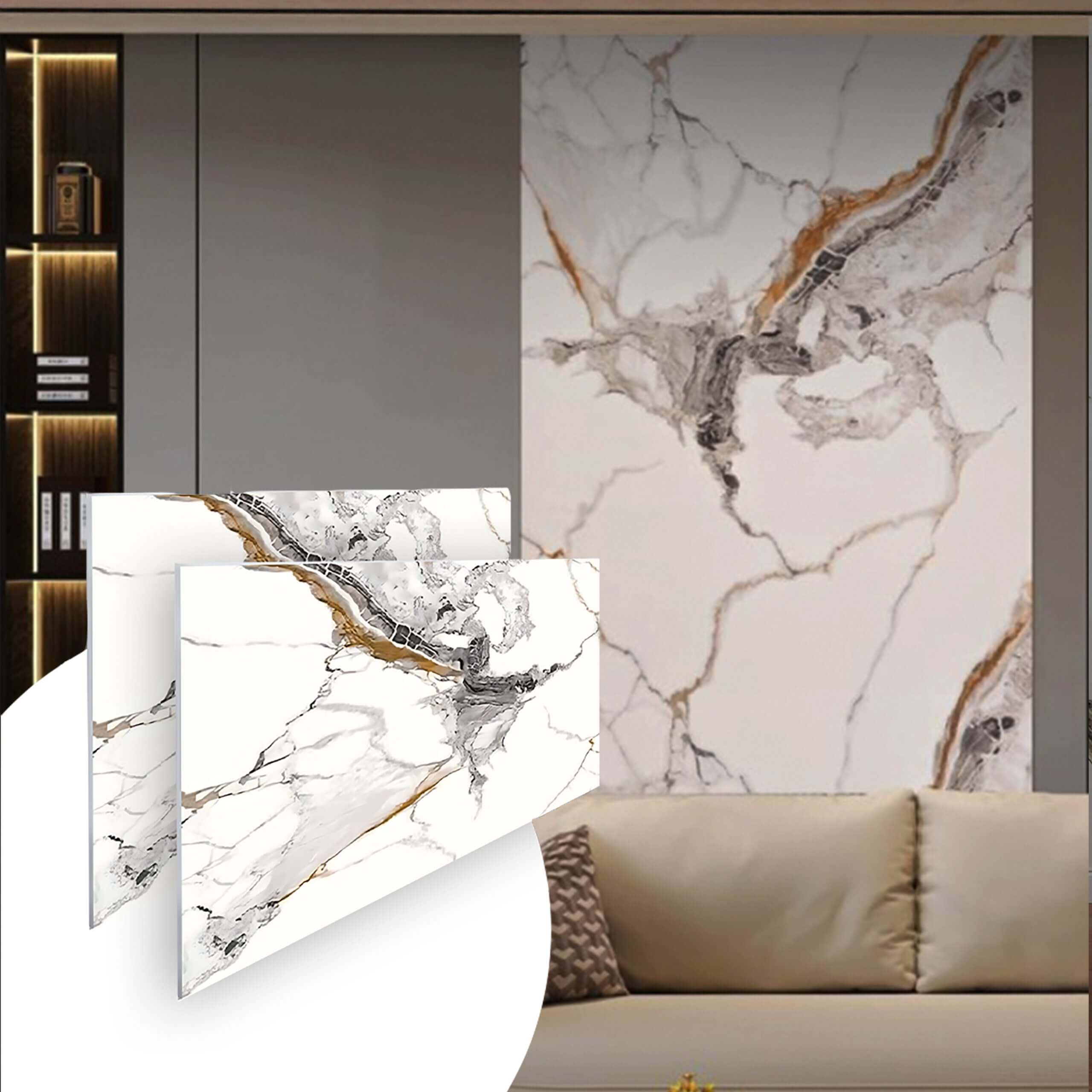 These panels are composed of a PVC base for stability and water resistance, a printed marble design for a high-end look, and a UV-cured protective coating for durability against scratches, stains, and UV fading. They pair beautifully with furniture to create a cohesive, stylish look in any space.