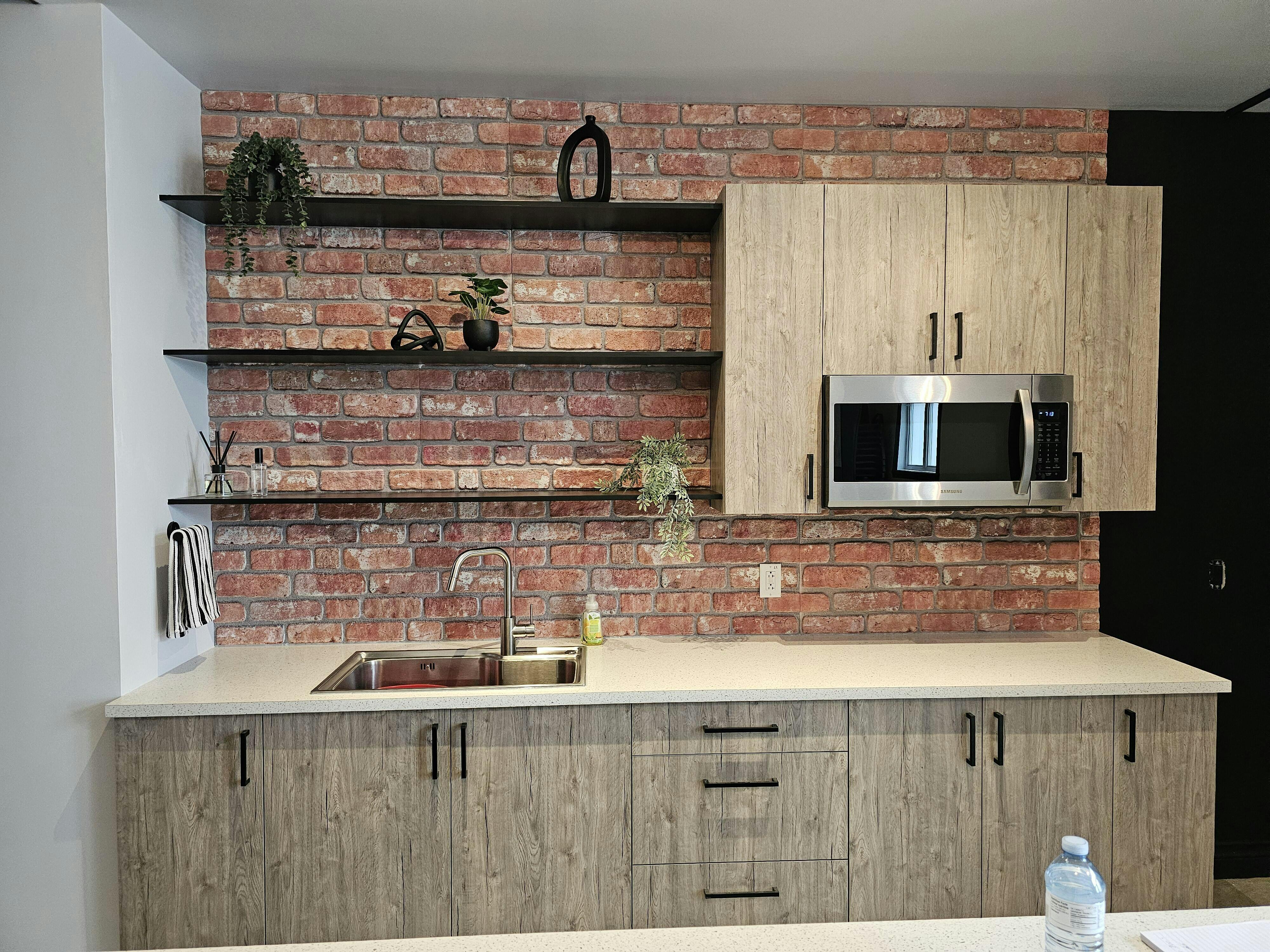 Looks so much like real brick. I do wish the panels sides were staggered so it fit together more like a puzzle to better hide the seams. I did that on my own and used the small cutouts for doorways. Highly recommend.